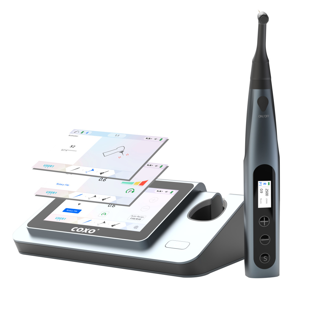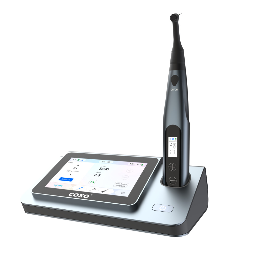 A COXO C-Smart-I PILOT vezeték nélküli endomotor és apexlokátor kombinációja, 150-1000 rpm fordulatszámmal, 0,6-3,9 Ncm nyomatékkal és 100-240 V tápellátással – ideális választás digitális endodonciai kezelésekhez.