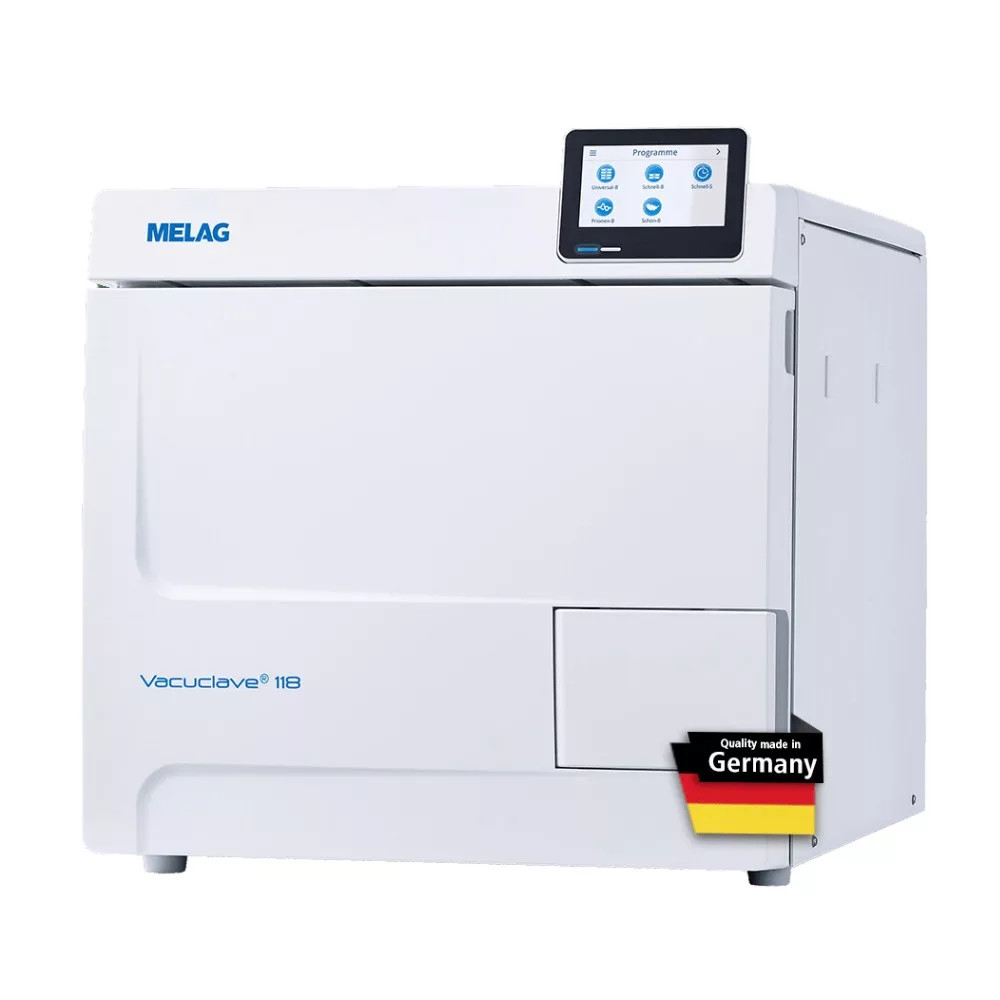 A Vacuclave 118 a MELAG Pro-osztályú autoklávok legújabb generációja, mely erőteljes B osztályú vákuumeljárással és nagy rakodási kapacitással rendelkezik. Intuitív kezelési koncepciója és könnyű dokumentációja modern és robusztus kialakítással párosul, mely ideális a hatékony sterilizációhoz az egészségügyi intézményekben.