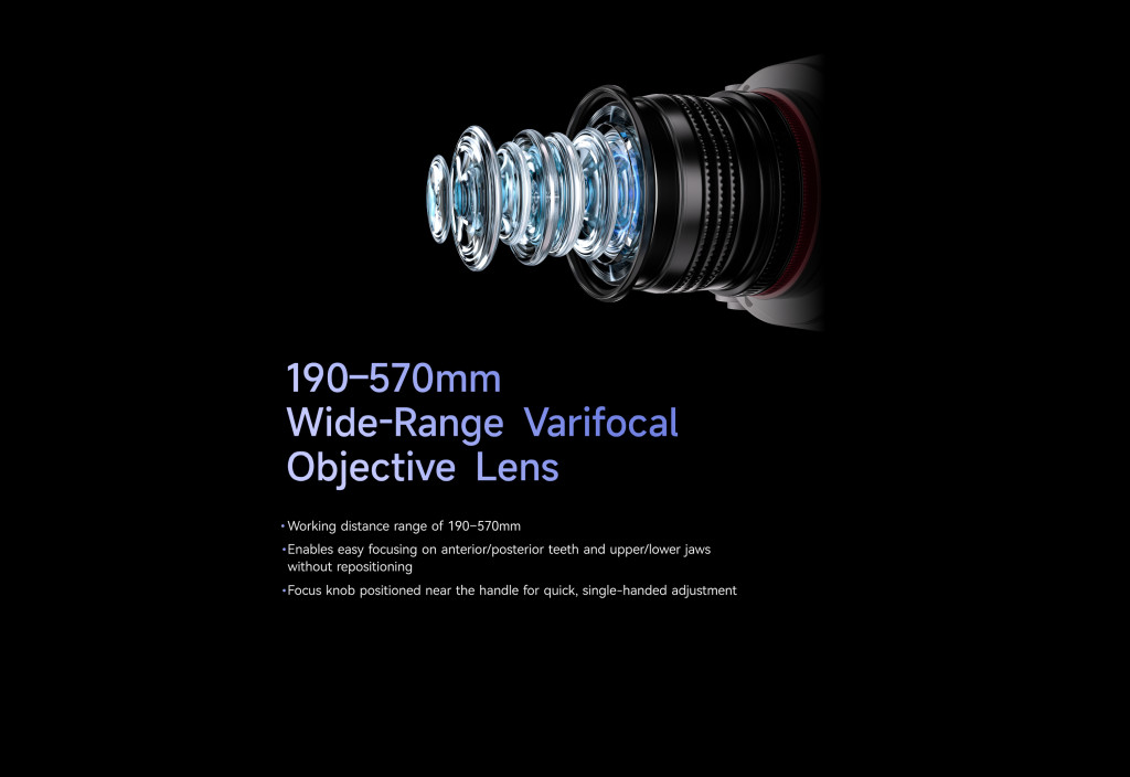 • Variofokális objektív, állítható munkatávolság kb. 190 mm – 570 mm – a különböző kezelési helyzetekhez és testtávolságokhoz.